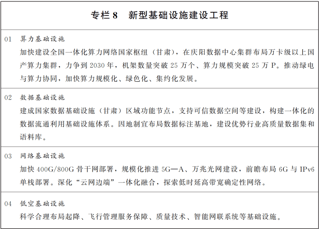 加强新型基础设施统筹规划和标准规范体系,进一步优化空间和结构布局,促进不同设施互联互通、集成融合和跨领域高效协同,筑牢数智化发展底座。优化升级信息通信网络,推进第五代移动通信演进(5G—A)、光网城市建设,深化“云网边端”一体化融合。全面推进全国一体化算力网络国家枢纽(甘肃)建设,进一步强化庆阳数据中心集群国家“算力高地”定位,加快推动绿电与算力协同,布局建设超大规模智算设施集群,统筹多元异构算力融合创新和算力基础设施规模化、绿色化、集约化发展。谋划打造“算力经济走廊”,积极探索“算力出海”新业态新模式。构建全省一体化算力资源监测调度体系,打造跨区域高效数据传输网络,促进东西部跨区域算力传输调度,不断提升普惠易用算力供给能力。