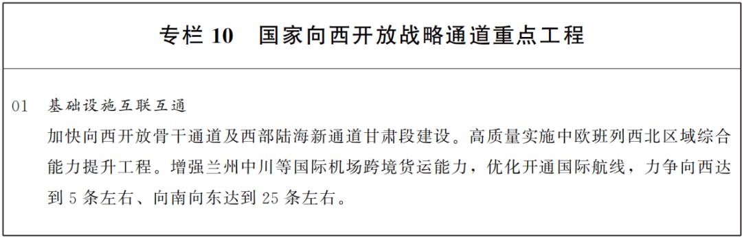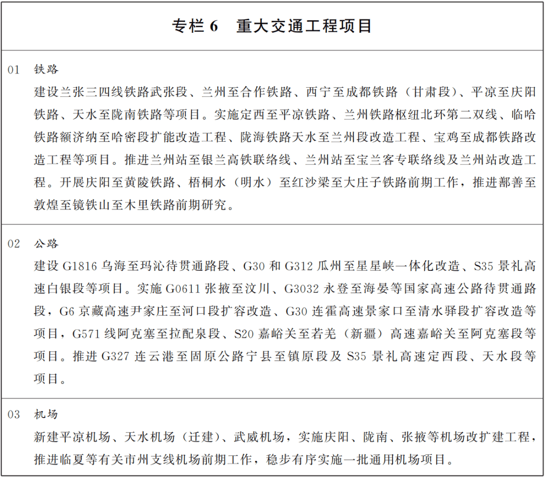 坚持枢纽机场提升功能、支线机场改造扩建、新建机场合理有序、通用机场因地制宜,扩大航空网覆盖水平。开工建设平凉机场,力争天水、武威机场开工,有序推进张掖、庆阳、金昌等支线机场改扩建,精准布局一批通用机场项目,推动形成以兰州中川国际机场为中心、东西机场群为两翼,干支协调、功能互补、联动发展的民航机场网络格局。开通和加密京津冀、长三角、粤港澳等地区重要城市航线网络。