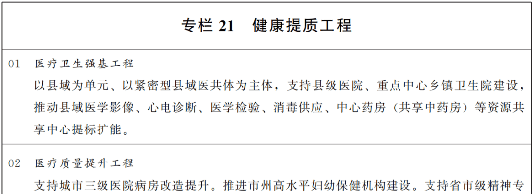 优化医疗机构功能定位和布局,坚持医疗卫生事业公益性,健全医疗、医保、医药协同发展和治理体系。推进优质医疗资源扩容下沉和区域均衡布局,充分发挥国家和省级区域医疗中心作用,提高省级卓越专科和临床重点专科能力,建设高水平医院。实施医疗卫生强基工程,推进县域急危重症救治中心建设,补齐基层医疗卫生机构专业短板,实现紧密型县域医共体建设全覆盖。落实基层首诊制度,加快建设分级诊疗体系。加强基层医疗卫生队伍建设,健全家庭医生签约服务制度,提升基层医疗卫生服务能力。推进全民健康数智化。深化以公益性为导向的公立医院改革,建立以医疗服务为主导的收费机制,完善薪酬制度,强化综合监管,建立编制动态调整机制。引导规范民营医院发展。完善药品供应保障体系,优化药品和医药耗材集中带量采购政策。