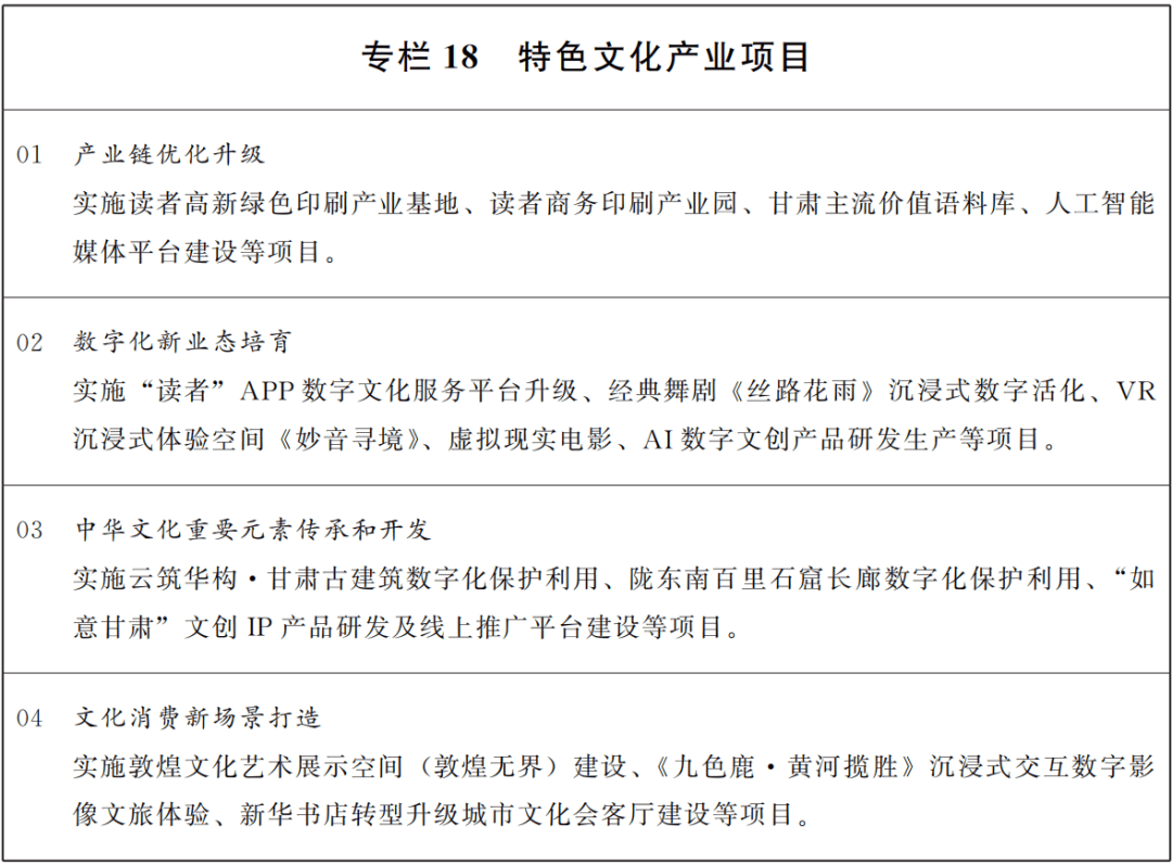 实施积极的文化经济政策,落实特色文化产业项目带动战略,发展文化制造业、文化服务业等业态,优化文化产业结构布局,扩大城乡居民文化消费。加快推进文化产业集群发展工程、骨干文化企业培育工程、文化产业孵化工程,培育壮大一批规模以上文化企业,建设一批特色鲜明、主业突出、集聚度高、带动性强的文化产业园区和基地,做大做强产业链和产业集群。加快文化产业数字化发展,推动出版、印刷、影视、演艺、媒体等数智化转型升级,大力发展网络视听、数字艺术、数字出版、沉浸式体验等新型文化产业业态。加强版权保护和开发利用。健全网络文学、网络游戏、网络视听等监管制度。积极发展对外文化贸易,培育建设兰州、敦煌国家文化出口基地。