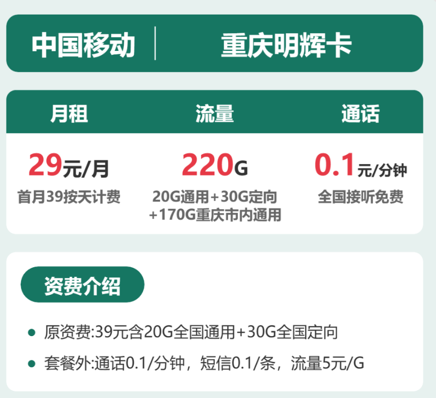 重庆移动明辉卡是一款面向本地用户的高流量套餐,其核心资费信息如下:月租方面,套餐首月按 39 元 / 月按天计费,2-6 个月月租为 29 元 / 月,7-24 个月月租为 39 元 / 月;流量方面,套餐内包含 20G 全国通用流量、30G 全国定向流量,叠加 170G 重庆市内通用流量,合计 220G 流量,定向流量可支持百度系、网易系、头条系、快手、腾讯视频、优酷视频等上百款 APP 使用,具体定向流量 APP 可能有变动,以运营商官方为准;通话方面,全国接听免费,套餐外通线 元 / 分钟,短信 0.1 元 / 条,流量超出套餐后按 5 元 / G 计费。