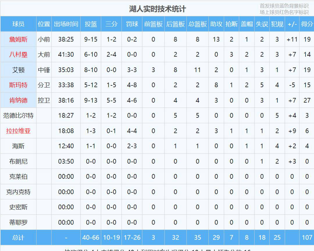 尽管火箭第一节投篮整体效率尚可,但湖人严密的防守迫使持球人屡屡受阻,特别是在夹击申京的压力下出现失误。随着比赛推进,火箭逐步提高防守强度,降低了湖人的投篮命中率,上半场结束时湖人依然领先两分。上半场数据亮眼,湖人整体命中率64.7%,三分命中率42.9%,艾顿、肯纳德以及詹姆斯都表现出色。