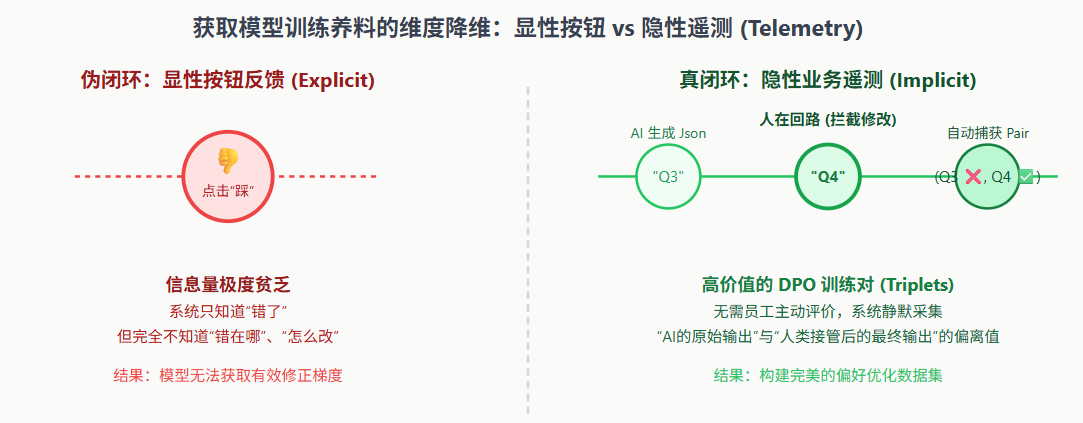 这在严肃的软件工程中简直是自欺欺人。原因有二:第一,极低的召回率。在真实的、高压的业务操作中,没有哪个员工有闲情逸致每次都去给 AI 的回答点赞或点踩。这种显性反馈(Explicit Feedback)的收集率通常不到 1%。第二,极低的信息熵。就算员工点了一个“踩”,系统依然不知道 AI 到底错在了哪里——是金额算错了?还是语气不够礼貌?仅仅一个布尔值(True/False),根本无法为庞大的神经网络提供修正梯度的方向。