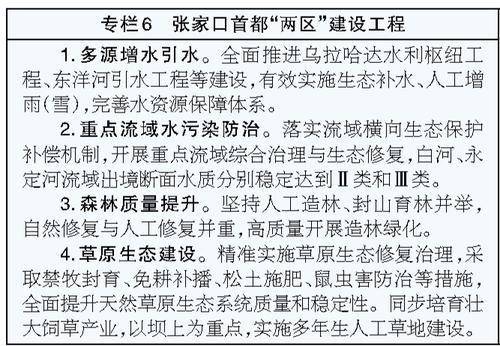 围绕打造首都水源涵养功能区和生态环境支撑区,加快生态补水和水土治理,巩固地下水超采治理成效,接续实施永定河流域综合治理工程,与北京共同推动官厅水库生态修复和饮用水源地恢复,大力实施造林绿化攻坚,构筑更加牢固的首都生态安全屏障。深入实施奥运遗产保护开发利用,推动冬奥场馆多元化、市场化利用,加快发展后奥运经济,组织开展一系列集竞技性、观赏性、参与性于一体的国际国内体育赛事,促进冰雪运动、冰雪旅游、冰雪产业融合发展,打造京张体育文化旅游带。支持张家口培育壮大大数据、装备制造、新能源等产业,支持大数据产业拓展新领域、新赛道,高质量建设燃料电池汽车示范应用城市。