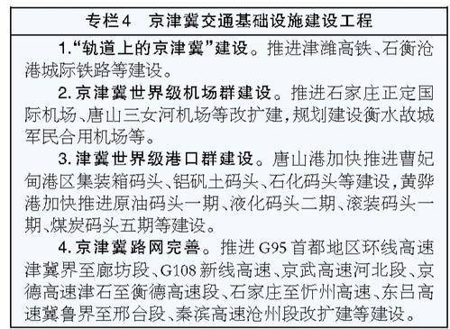加强基础设施“硬联通”建设,巩固提升“轨道上的京津冀”通达性和便利度,实施一批重大公路交通联通项目,完善区域一体化交通网络。提升规则标准“软联通”水平,创新推出京津冀公交化运营等一批出行便利化措施,联通断点、打通堵点,提升区域出行效率。共同建设京津冀世界级机场群、港口群,强化石家庄正定国际机场区域航空枢纽功能,深化与首都国际机场、北京大兴国际机场、天津滨海国际机场分工合作,协调优化航路航线结构;加强与天津港在港航物流、金融、航线等领域对接合作、合理分工、错位发展,提升港口群整体竞争力。