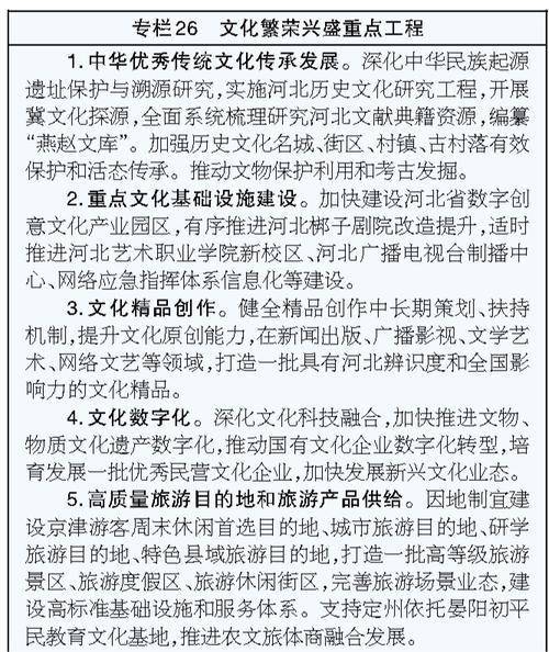 深入挖掘涿鹿之战、釜山合符、避暑山庄、长城、大运河等文化资源,延续历史文脉,激活文化生命力。实施河北历史文化研究工程,鼓励开展经典文学、文化典籍研究,推出一批系统权威的文化版本和标志性研究成果。深化考古研究,推出一批具有重要影响力的考古成果。深入实施中华优秀传统文化传承发展工程,推动文化遗产系统性保护和统一监管督查,完善文化遗产保护名录,加强历史文化名城名镇名村、街区和重点文物、革命文物保护利用,建好用好长城、大运河国家文化公园(河北段)。深入挖掘燕赵文化深厚底蕴,推动构建中华文明标识体系,形成精神理念标识、物质文明理念标识、文化符号标识等多维度立体体系。加强非物质文化遗产保护传承,加强对全省非遗传承人的培养。深入实施中国传统节日振兴工程和河北地方戏剧振兴计划。