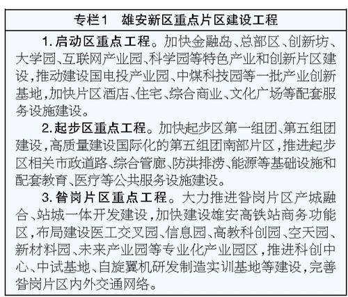 集中力量推进启动区建设,加快总部区、金融岛等特色产业和创新片区建设,推进国贸中心、中央绿谷、雄安城际站等标志性建筑建设运营,全面提升城市综合服务、公共服务、商业服务功能,打造现代化城市先行发展示范区。加快起步区第一组团、第五组团建设,推进市政、商业、文体等配套设施建设,全面提升城市品质。加快建设昝岗片区高端高新产业集聚区,发挥高新区、自由贸易试验区叠加优势,