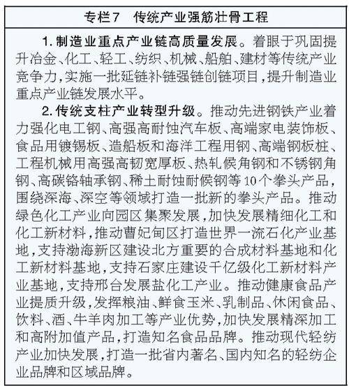健康食品。稳定面粉、食用油、乳制品等基础加工规模,巩固方便面、挂面、天然色素提取等领域优势地位,发展壮大粮油精深加工、高端特色乳制品、功能调理食品、优质酒及健康饮料等高附加值产品。加快产业集聚发展,建设环京津乳制品、燕山—太行山果品深加工产业基地及一批特色食品产业集群。深化精品食源工程,大力发展高端食品配套的优质种源和原料产品,强化食品原料技术创新,完善优质食源生产质量标准。推进食品与文旅、康养、文化创意等产业融合,发展“中央厨房+冷链配送”等产业新模式。挖掘地方特色,打造一批冀酒、冀菜等区域品牌。