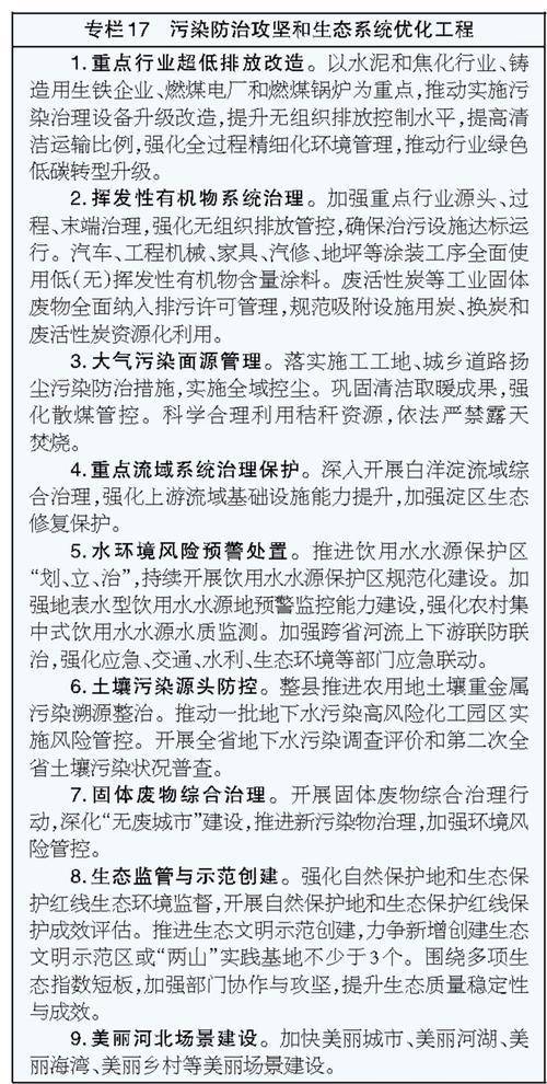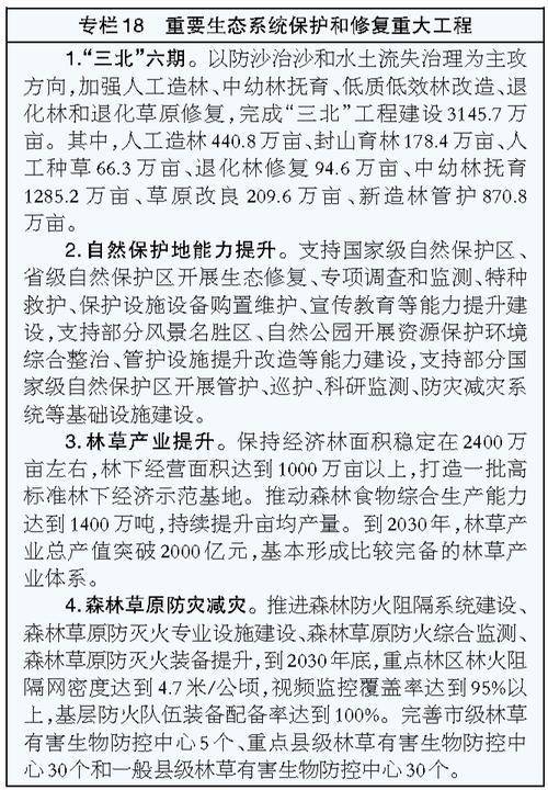 ——美丽河北建设取得新的重大进展。绿色生产生活方式基本形成,2030年前碳达峰目标如期实现,清洁高效、多元支撑的新型能源强省加快建设,生态环境质量全面改善,主要污染物排放总量持续减少,森林覆盖率达到27.67%,生态系统多样性稳定性持续性不断提升,天蓝、地绿、水秀景象更加秀美,城乡人居环境大幅改善,基本建成京津冀美丽中国先行区。