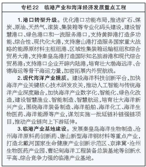 强化港口功能,做强临港产业,提升港城发展能级,实现以港聚产、以产兴城、以城促港。支持各级各类园区、开发区平台建设,吸引上下游配套产业向园区集聚,做大做强曹妃甸区、秦皇岛开发区等园区。加快扶持一批临港产业、海洋产业功能园区和产业基地,引进一批临港产业、海洋产业重大项目、重大工程。依托曹妃甸区、北戴河新区、渤海新区,优化产业生态,提升科创研发、商贸金融等现代服务业态,壮大船舶代理、货运代理、流通加工等港航服务业,完善教育、医疗、文化等城市配套服务功能,吸引人口集聚,集约打造港产城融合发展特色片区。