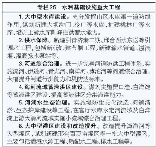 完善提升农村供水设施,南水北调受水区提档升级农村管网基础设施,其他平原区和燕山太行山坝上地区推进城乡供水一体化,大力建设农村规模化供水设施,其他地区实施小型供水工程规范化建设和改造。推进灌区现代化建设与改造,研究论证新建大型灌区,实施漳滏河等大中型灌区续建配套和现代化改造,完善灌排骨干工程体系,适度新增灌溉面积,建设设施完善、用水高效、管理科学、生态良好的现代化灌区,构建“旱能灌、涝能排”的现代化农田水利设施体系。