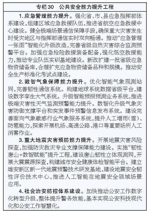 ——平安河北建设达到更高水平。国家安全体系和能力进一步加强,粮食综合生产能力达到800亿斤,能源综合生产能力达到1亿吨标准煤,重点领域风险得到有效防范化解,社会治理和公共安全治理水平明显提高,重特大事故得到有效遏制,自然灾害防御能力显著提升,统筹发展和安全的能力不断增强。