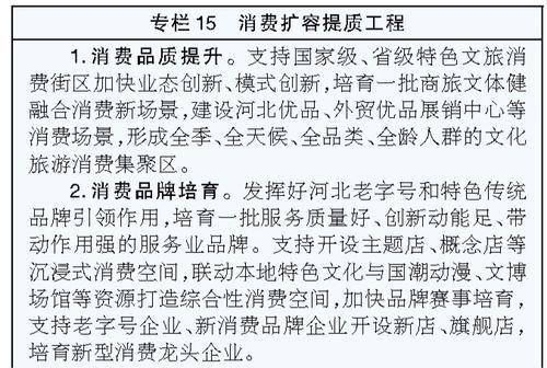 实施高品质旅游品牌打造行动,按照市场需求稳妥有序建设旅游景区,精心打造冰雪运动、草原避暑、海滨度假、温泉康养、乡村游乐、生态观光、科普研学等特色旅游产品,培育具有河北特色和国内外知名度的旅游品牌。加快建设长城、大运河、太行山、渤海滨海文化旅游带,支持一批现有重点旅游景区和度假区提档升级,推出彰显河北优势资源特色主题线路品牌。实施京津游客倍增计划,发展短途旅游、微度假,打造京津游客周末休闲首选目的地。发掘区域旅游资源,加快建设各具特色的旅游名城名县。发挥红色文化资源优势,打造红色旅游精品线路。实施高精准旅游市场营销宣传推广行动,支持各地策划推广地方旅游品牌,打造河北旅游热点。