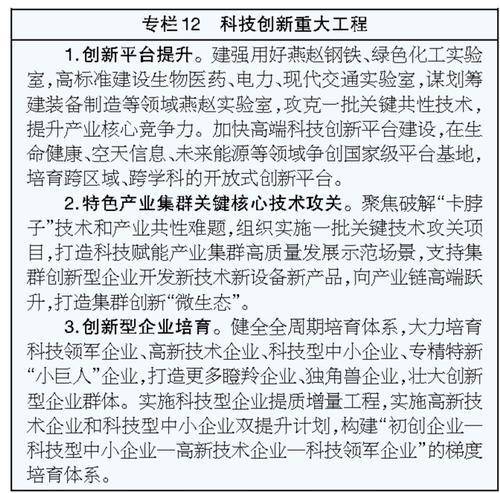——科技创新能力大幅提高。科技创新体系整体效能显著提升,全社会研发经费投入年均增长6%左右,研发投入强度达到更高水平,教育科技人才一体发展格局基本形成,关键领域核心技术取得突破,产出一批重大创新成果,科技创新和产业创新深度融合,创新驱动作用明显增强,绿电、算力、数据、场景、产业融合发展实现新突破,创新型河北建设取得显著成效。