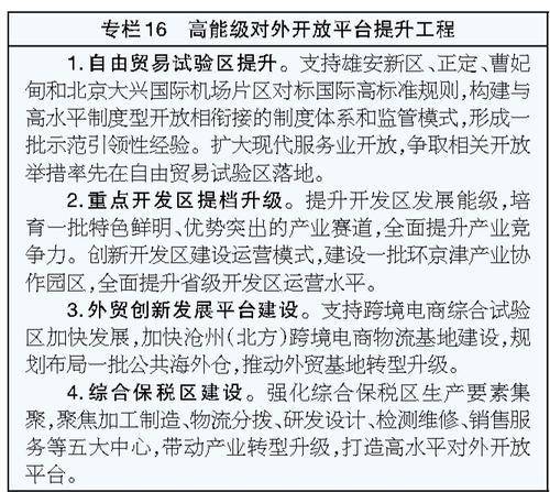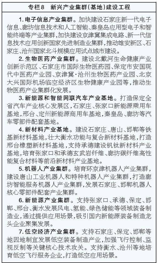 完善推动京津冀更好发挥高质量发展动力源作用的体制机制,依托重点交通干线打造六大联通京津、辐射全省经济廊道,畅通人流、物流、资金流、信息流,以线带面促进各类要素集聚发展。京保石邢邯经济廊道,推动与京津在商贸、物流等方面合作发展,联合建设科技研发、成果转化、场景示范等平台,推动电力及新能源装备、新能源和智能网联汽车、集成电路、生物医药、新能源、新材料、装备制造、食品加工等产业发展,打造先进制造业发展带和城镇聚集轴。京雄衡经济廊道,加快京雄新质生产力走廊建设,培育生命科学、空天信息等未来产业,加强商业航天、氢能产业链协同,推进衡水金属制品、工程材料、绿色建材等产业升级,加强与雄安新区联动发展。京张经济廊道,加快建设京张体育文化旅游带,构建张家口—北京—廊坊—天津算力廊道。京廊津沧经济廊道,健全与京津重点园区协同对接机制,推进廊坊打造新型显示、大数据、人工智能、航空航天等领域电子信息产业聚集带,推进沧州打造京津高端化学药、智能制造、新材料等领域科技成果转化基地,加强与天津港合作,大力发展集装箱运输,提高干支联运、海铁联运和远洋航运能力。京唐秦经济廊道,支持唐山、秦皇岛与北京高校、科研院所共建创新平台,加快发展轨道交通、机器人、船舶、生命健康、应急装备、绿色化工等产业。京承经济廊道,推进京承文旅、康养、新能源、新材料等产业协同发展,支持承德与北京合作,发展风光发电装备产业,联合打造环京度假休闲康养旅游带。