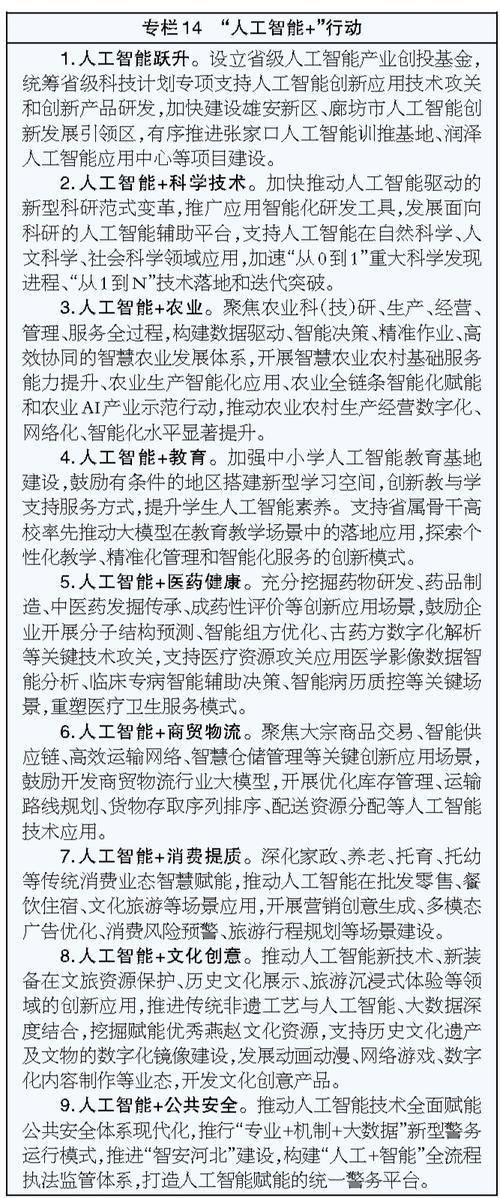 机器人。发展机器人整机及配套产业,持续巩固焊接机器人等细分领域优势,大力发展以消防救援、轨道装备检测和光伏清扫为重点的特种机器人,加快培育教育机器人、智能养老机器人、建筑机器人等。加强高精密减速器、机械臂等关键技术装备和零部件研发,强化与京津机器人产业链共建共享,加快建设省概念验证中心机器人分中心。深入开展“机器人+”行动,打造机器人典型应用场景,推动机器人在各行业应用落地。
