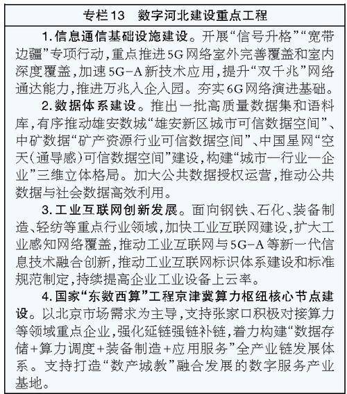 实施高速智能信息网络建设工程,打造基于5G、窄带物联网高低搭配、泛在智联的移动物联网体系,有序推进5G网络向5G-A升级演进,推进5G网络深度覆盖,加快5G-A部署,夯实6G网络演进基础。深化千兆光网部署,有序推进万兆光网建设发展,推动网络向超高速、大容量、智能化升级演进。深入推进互联网协议第六版(IPv6)规模部署和应用,持续完善IPv6技术、产业、设施、应用和安全体系。配合国家做好卫星互联网系统地面设施建设,规划低轨卫星互联网地面信关站,建设国家北斗导航位置服务数据中心河北分中心。