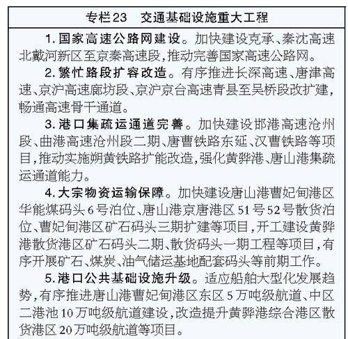 推动国家综合立体交通网主骨架省内段全部贯通,基本建成高速铁路“八纵八横”主通道河北段,提升铁路货运能力,完善港口集疏运体系。基本贯通国家高速公路通道,加快重要通道和繁忙路段扩能改造,推动普通干线省域路网联通,开展新一轮农村公路提升行动,持续推进“四好农村路”高质量发展。稳妥推进适宜河段旅游通航。推动建设世界级港口群,持续推进港口转型升级,完善港口功能布局,有序推进煤炭、原油、液化天然气(LNG)、矿石、集装箱等专业化泊位建设。合力打造京津冀世界级机场群,推进石家庄正定国际机场、唐山三女河机场等改扩建,新建衡水军民合用机场,研究谋划沧州支线机场,建设一批通用机场。打造一体融合交通枢纽,强化全国性综合交通枢纽城市功能,推进区域性综合交通枢纽城市建设,加强综合枢纽港站一体化规划建设。加快邮政快递枢纽建设,提升转运效率。