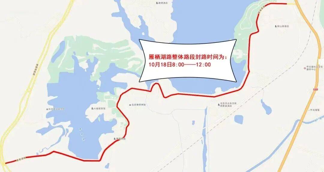 2025(第九届)北京怀柔徒步大会将于10月18日(星期六)上午8:00至12:00在环雁栖湖路举行,届时雁栖湖路全路段将实施临时交通管制,禁止所有机动车、非机动车通行。