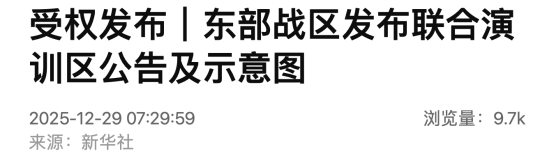 12月29日开始,中国人民解放军东部战区组织陆军、海军、空军、火箭军等兵力,位台湾海峡、台岛北部、台岛西南、台岛东南、台岛以东,组织“正义使命-2025”演习,重点演练海空战备警巡、夺取综合制权、要港要域封控、外线立体慑阻等科目,舰机多向抵近台岛,诸军兵种联合突击,旨在检验战区部队联合作战实战能力。这是对“台独”分裂势力和外部干涉势力的严重警告,是捍卫国家主权、维护国家统一的正当必要行动。
