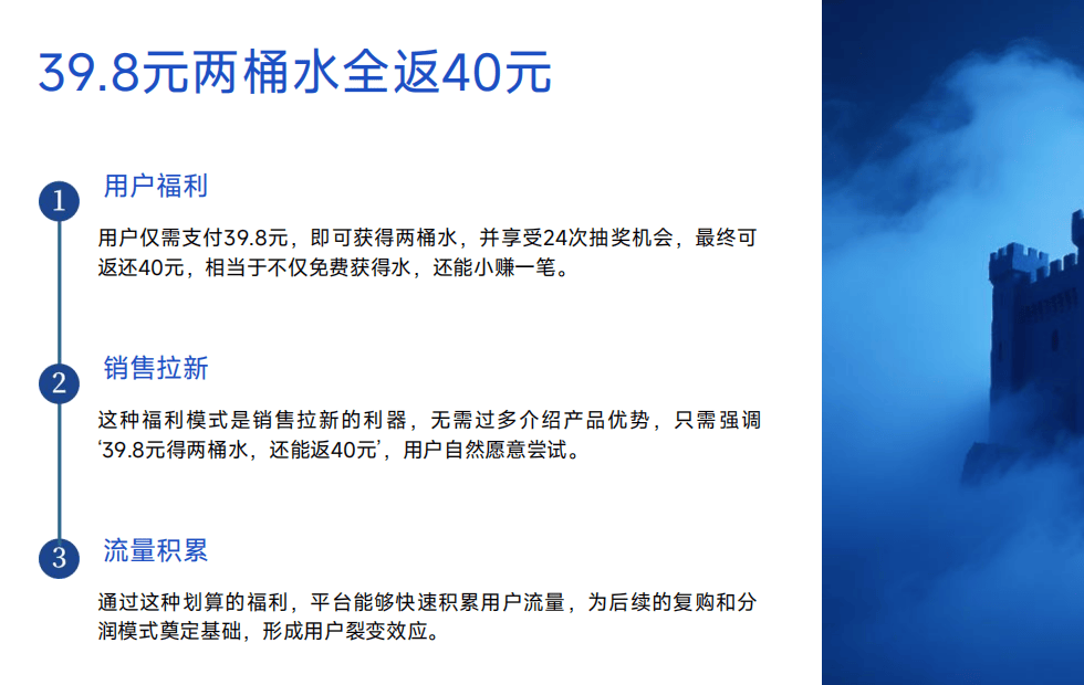 :投资2999元,得100桶水,收益=配送费3元/桶 + 推广费2元/桶 + 复购佣金10%。