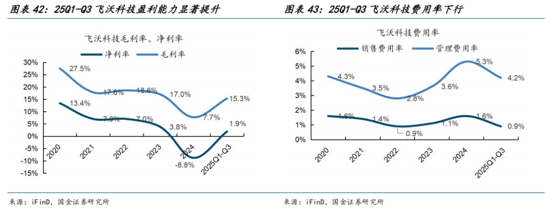 25Q1-Q3飞沃科技费用率下行,盈利能力显著提升。营收规模的增长,带来固定成本均摊降低,规模效应显现带动公司销售费用率、管理费用率下行,25Q1-Q3飞沃科技销售费用率、管理费用率为4.2%、0.9%,相对24年降低1.1pct、0.7pct。费用率下行叠加产品销售价格提升,飞沃科技25Q1-Q3净利率提升至1.9%,相对24年提升10.7pct。