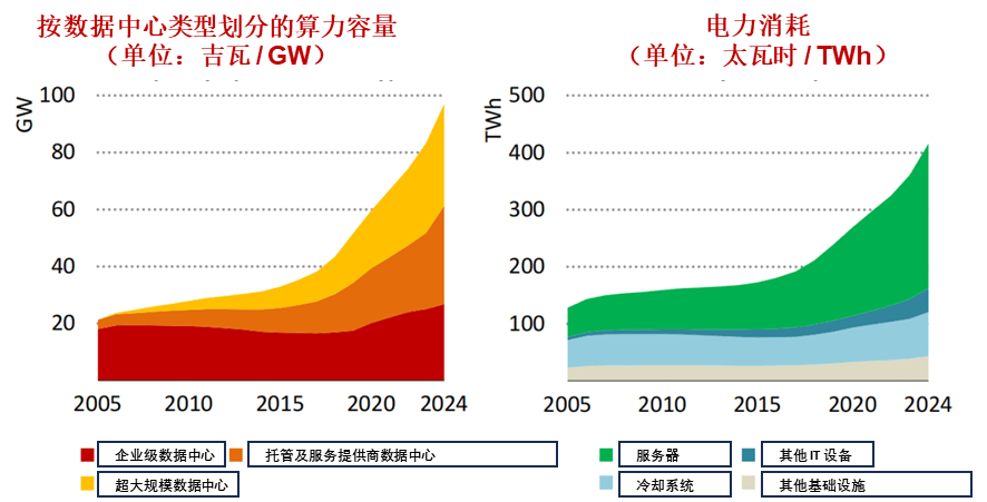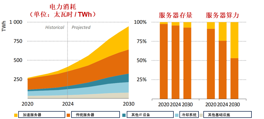 AI 大模型及相关应用的爆发式发展,直接推动 AIDC 用电量大幅攀升。中国电力企业联合会数据显示,2024 年我国互联网数据服务用电同比增长 30.9%,2025 年全国算力基础设施用电量预计达 3600 亿千瓦时,占全社会总用电量 3.5%。国际能源署统计,2024 年全球数据中心总耗电量 415 太瓦时,占全球电力消费 1.5%。