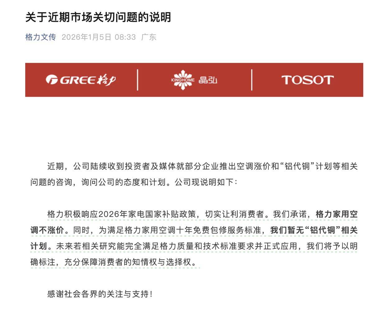 昨天,格力官微「格力文传」发布说明称,近期公司收到多方关于部分企业上调空调价格及推进「铝代铜」方案的询问。格力表示,将积极响应今年家电国家补贴政策,继续让利消费者,并承诺格力家用空调价格保持稳定。