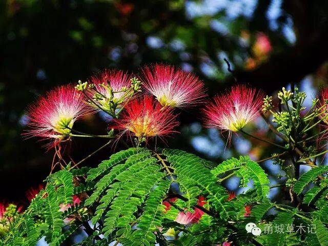 合欢是豆科含羞草亚科合欢属的一种植物,它从外形来看就是一个放大的含羞草。合欢的名字在古时候是叫“合昏”,这个什么意思呢?就是说到了黄昏,它的叶子会卷起来,枝叶相交,所以叫“合昏”。合欢的花朵,是十多束细细的粉色花丝放射状排成半个扇面,非常好看,所以我用了秦观的“自在飞花轻似梦”这个名句做标题,用来形容这种美好。