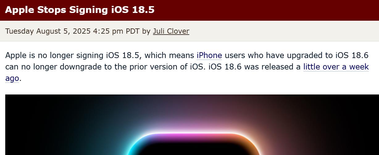 【环球网科技综合报道】8月6日消息,据外媒macrumors报道称,苹果公司今日宣布,已停止对 iOS 18.5 的签名验证shadowrocket港区下架。这意味着已经升级到 iOS 18.6 的 iPhone 用户无法再降级到之前的 iOS 18.5 版本。