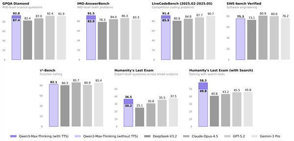 基于这一推理技术创新,千问推理性能和推理效率大为提升,比如在启用工具的「人类最后的测试」HLE 中,千问得分 58.3,大幅超过 GPT-5.2-Thinking 的 45.5、Gemini 3 Pro 的 45.8,录得当前所有模型的最高分。