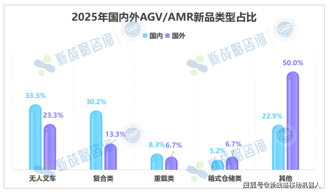 从2025年国内外AGV/AMR新品类型占比图中可以看出,国内外企业在产品布局上呈现出相似的趋势,其均重点聚焦于无人叉车与复合机器人品类。具体来看,国内市场表现尤为集中,超过六成的新品属于这两大类,反映出其对规模化落地和场景快速适配的强烈诉求。与此同时,国外企业同样将较大比例的资源投入这两类产品。