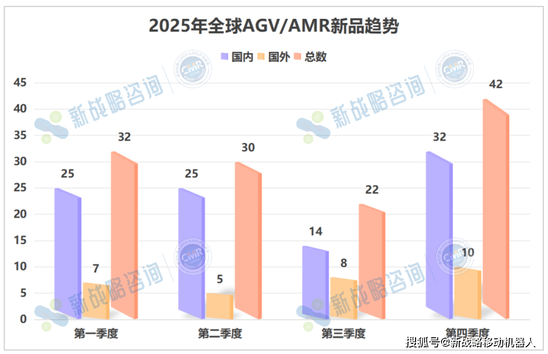 据CMR产业联盟与新战略移动机器人产业研究所统计,2025年全年各季度AGV/AMR新品发布量依次为32款、30款、22款、42款,呈现出清晰的“前稳—中收—后冲”曲线特征。前三季度整体未出现断崖式下滑,但三季度发布节奏已明显收敛;进入四季度,市场迎来强势反弹,42款的发布规模不仅实现“一季顶两季”的突破,更将年度新品发布的声量重新拉满。