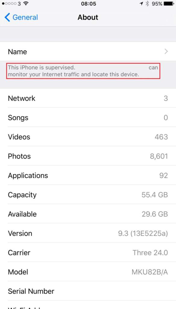 此外,根据测试者公布的截图,iOS 9.3 beta 5还能检测出iPhone是否正接受别人管理。比如下图显示,手机的设置中也会告知用户“这部iPhone正受到监控”。