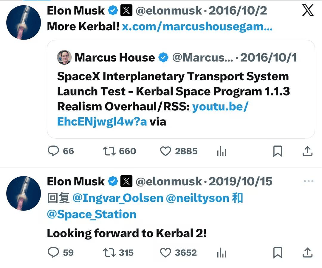 更离谱的是,在专业的航天领域,不少从业者也会把《坎巴拉》当作自己的“沙盘”。比如NASA火星项目的职员就公开直播玩过《坎巴拉太空计划》,而作为全地球最硬核的玩家,埃隆·马斯克更是毫不掩饰对它的喜爱,在16年的时候发推表达了自己对续作的期待。