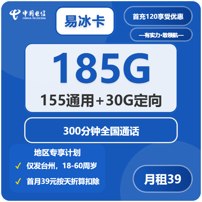 想办浙江电信台州本地流量卡,首先得认准台州专享的款式,电信易冰卡就是仅发台州的电信大流量卡,归属地直接是台州本地,办卡年龄要求18-60周岁,这个年龄范围覆盖了大部分人群,激活的时候还能当场选号,不用纠结选号的问题,这点特别贴心。这款卡优惠后月租39元,有两年优惠期,套餐包含185G每月的流量,其中155G是全国通用流量,30G是全国定向流量,还有300分钟的全国通用通话,对于日常使用来说完全足够了,而且是台州地区专享计划,只有台州用户能办,小韩聊卡也是按官方宣传的内容跟大家说,不会有半点夸大。