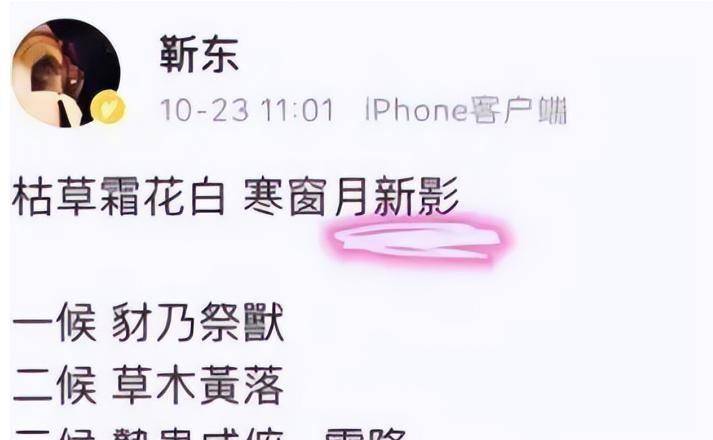 靳东在社交平台上发了一段诗词,不过有人注意到,他把“寒窗月影新”写成了“寒窗月新影”;还有,他把“亘古不变”写成了“恒古不变”。
