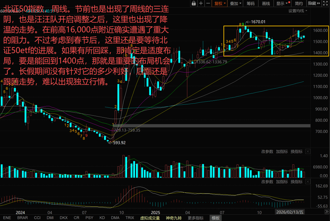 节前也是出现了周线的三连阴,也是汪汪队开启调整之后,这里也出现了降温的走势。在前高16,000点附近确实遭遇了重大的阻力。不过考虑到春节后,这里还是要等待北证50etf的进展。如果有所回踩,那肯定是适度布局,要是能回到1400点,那就是重要的布局机会了。长假期间没有针对它的多少利好,后面还是跟随走势,难以出现独立行情。