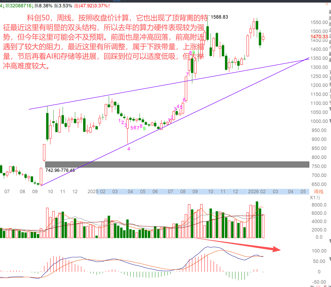 按照收盘价计算,它也出现了顶背离的特征最近这里有明显的双头结构,所以去年的算力硬件表现较为强势,但今年这里可能会不及预期。前面也是冲高回落,前高附近遇到了较大的阻力,最近这里有所调整,属于下跌带量,上涨缩量,节后再看AI和存储等进展,回踩到位可以适度低吸,但大举冲高难度较大。