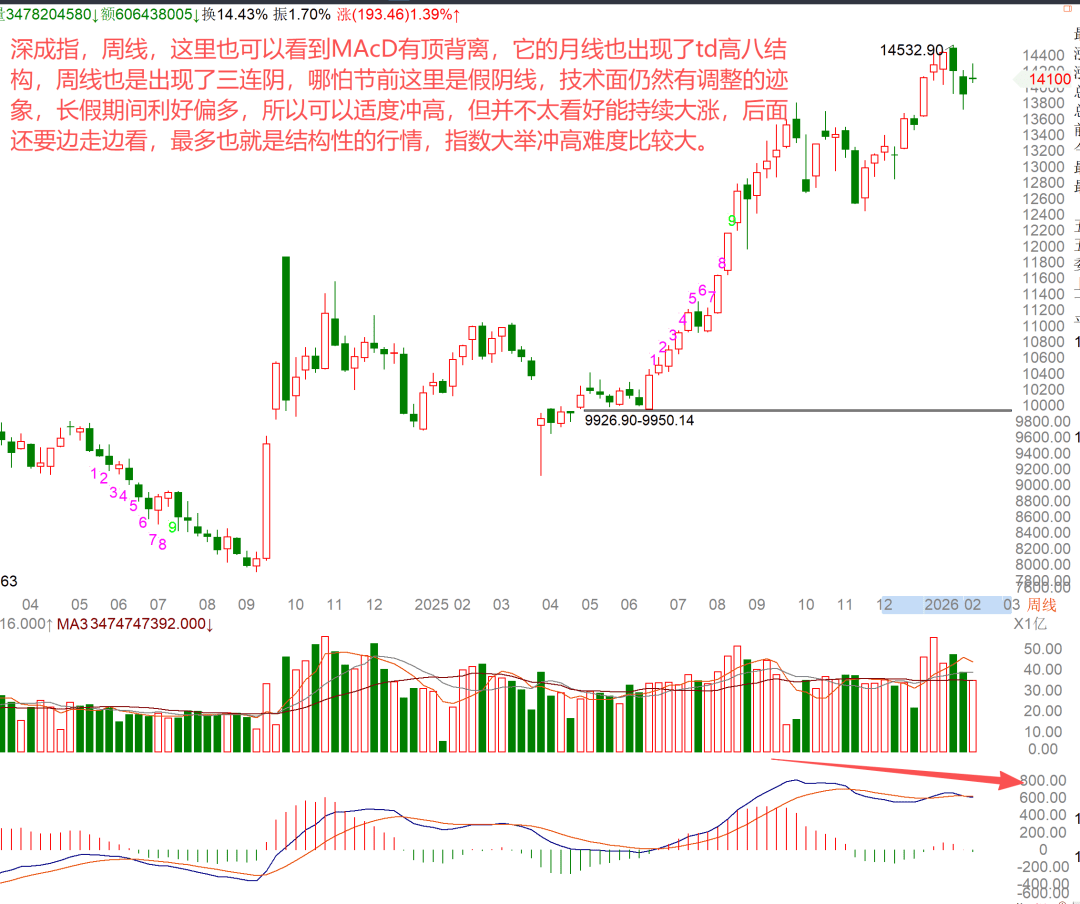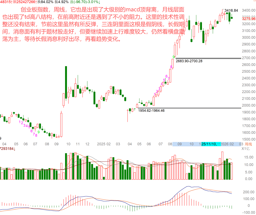 这里也可以看到MAcD有顶背离,它的月线也出现了td高八结构,周线也是出现了三连阴,哪怕节前这里是假阴线,技术面仍然有调整的迹象,长假期间利好偏多,所以可以适度冲高,但并不太看好能持续大涨,后面还要边走边看,最多也就是结构性的行情,指数大举冲高难度比较大。