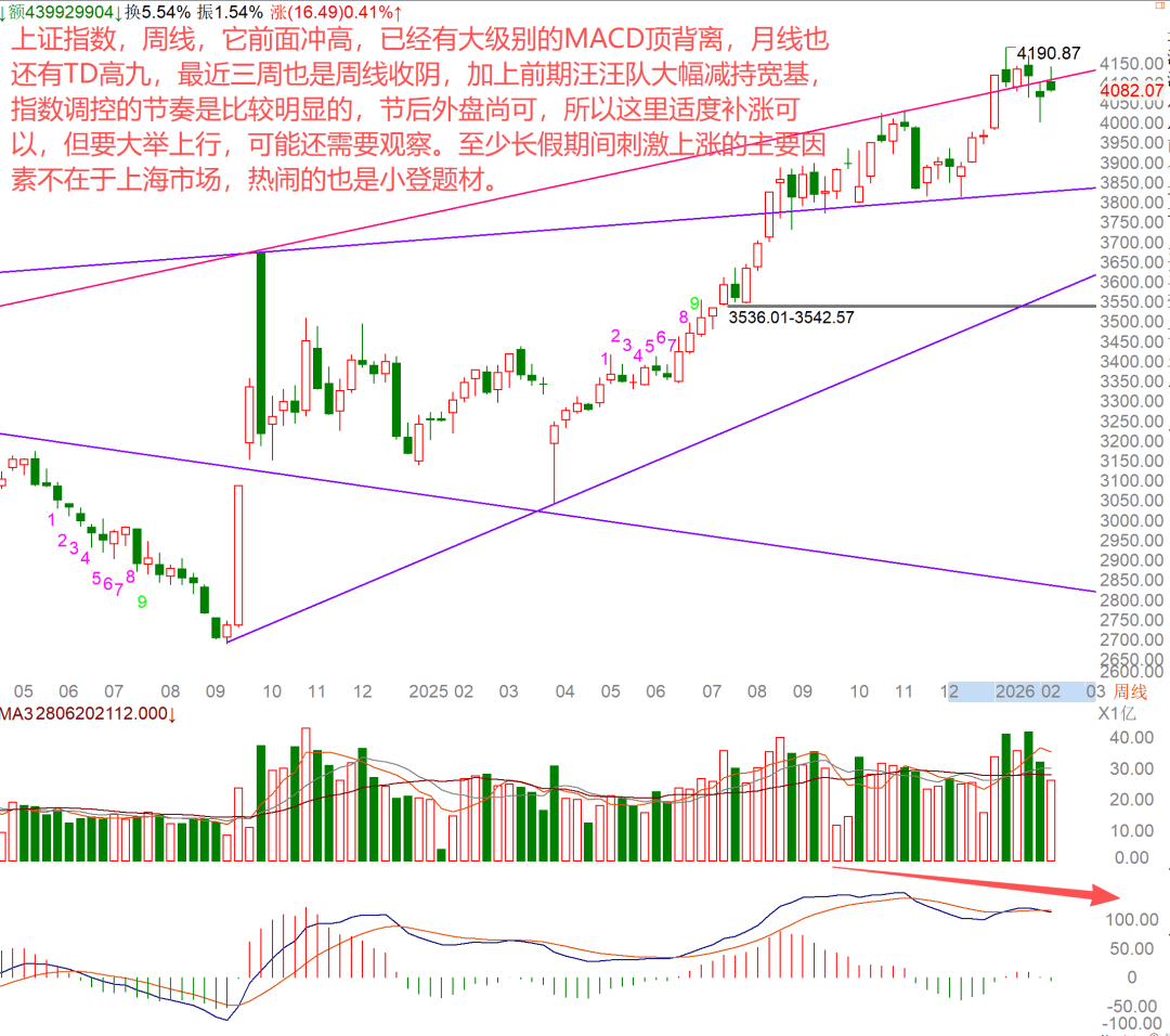 它前面冲高,已经有大级别的MACD顶背离,月线也还有TD高九,最近三周也是周线收阴,加上前期汪汪队大幅减持宽基,指数调控的节奏是比较明显的,节后外盘尚可,所以这里适度补涨可以,但要大举上行,可能还需要观察。至少长假期间刺激上涨的主要因素不在于上海市场,热闹的也是小登题材。