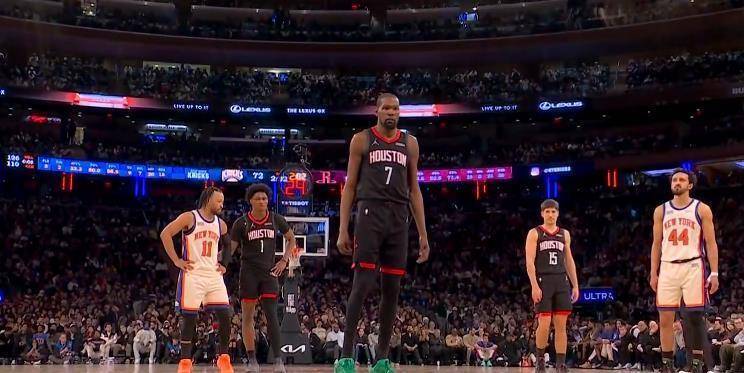 这场比赛的开局并不顺利。 火箭在第一节就陷入了得分荒,杜兰特前6次出手全部打铁,球队一度落后尼克斯13分。 整个第一节,火箭全队26投只有9中,三分球10投3中,进攻端显得滞涩而混乱。 尼克斯则依靠唐斯的内线强攻和阿奴诺比的外线三分,牢牢掌控着比赛节奏。 首节结束时,火箭以21比27落后6分。