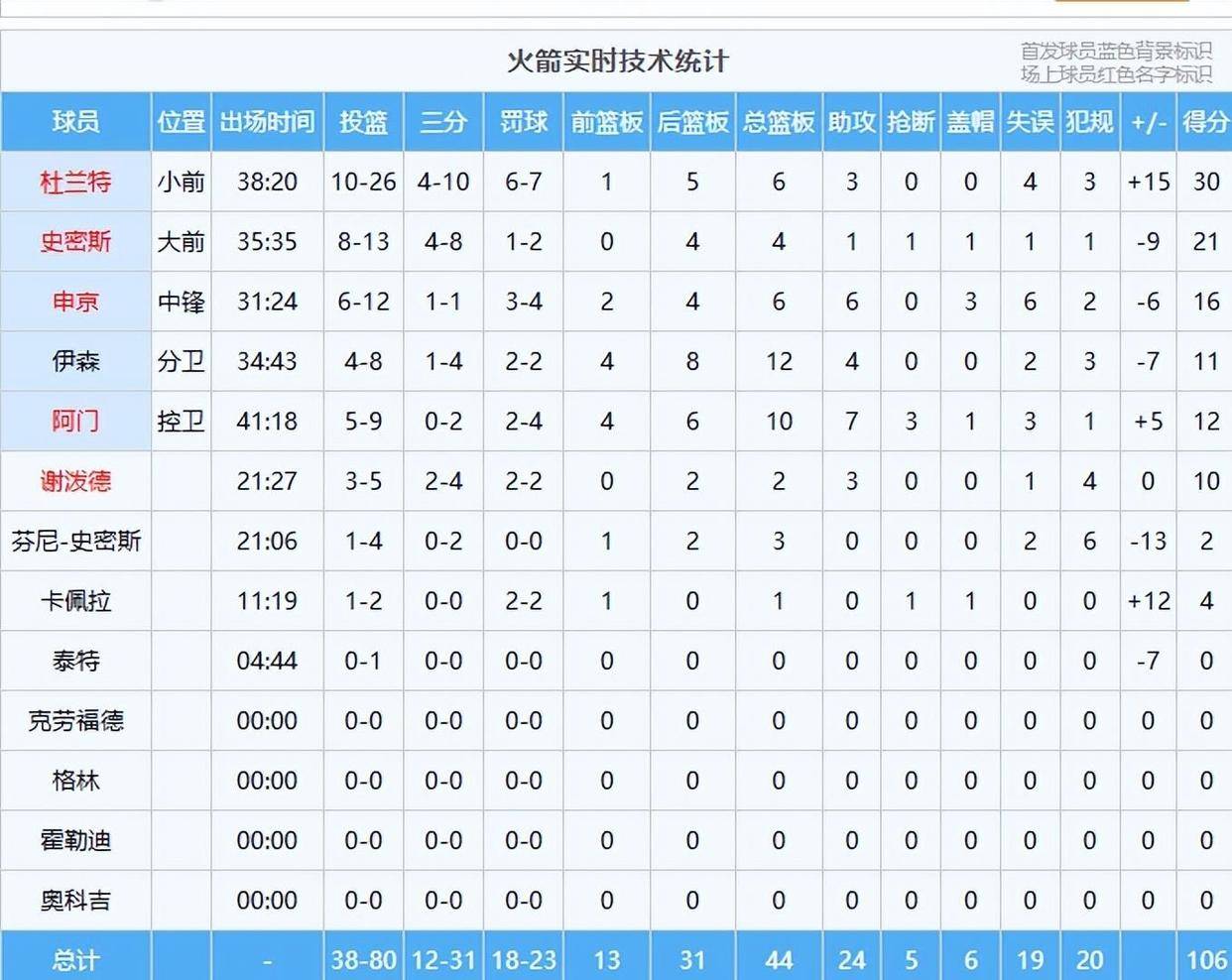 比赛的技术统计显示,火箭全场出现了19次失误,其中杜兰特4次,申京6次,阿门3次,伊森2次,史密斯1次。 尼克斯只有8次失误,其中第四节0失误。 在篮板球方面,火箭以45比44略微领先,但他们在关键时刻的防守篮板上出现了多次漏洞。 唐斯在第四节连续抢到前场篮板并完成二次进攻,这对火箭的士气造成了沉重打击。
