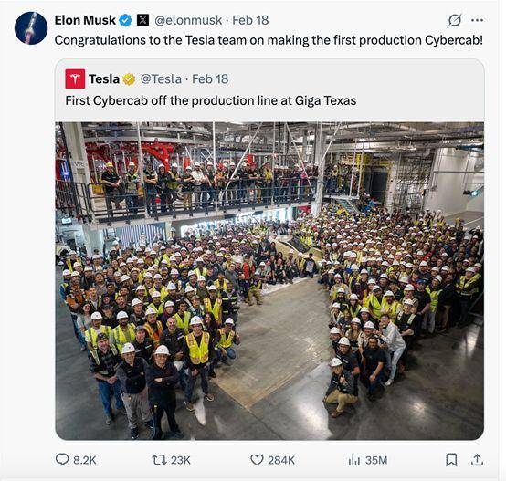 特斯拉的官方账号发布了一张照片——美国得克萨斯州超级工厂,一群头戴白色安全帽的工人簇拥着一辆造型科幻的金色车辆,对着镜头露出发自内心的笑容。