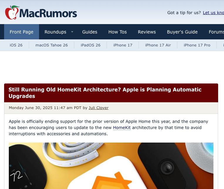 【环球网科技综合报道】7月2日消息,据科技媒体MacRumors及多家外媒报道,苹果在最新推送的iOS 18.6 Beta 2版本中,通过“家庭”App向用户发出重要通知:基于旧版架构的HomeKit设备将于2025年秋季正式停止支持。若用户未及时更新,部分智能家居配件、自动化场景及安防功能可能面临中断风险。