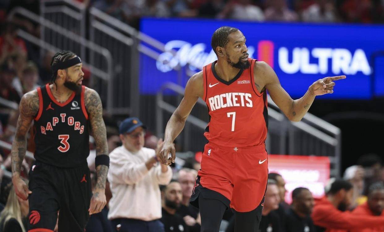 进入第二节,火箭的替补席开始发挥作用。 谢泼德底角接球速射三分命中,申京在内线背打勾手得分,火箭打出一波小高潮。 然而猛龙的RJ·巴雷特突然爆发,他里突外投连得6分,带领球队反超比分。 关键时刻,杜兰特再次站了出来,他命中干拔三分,申京也强硬打成2 1。 但巴雷特的手感已经无法阻挡,他再中一记三分,单节一人狂砍11分。 比赛的转折点出现在第二节后半段,杜兰特彻底接管了比赛。 他先是命中定点三分,随后又强突巴恩斯命中中投,带领火箭打出一波攻势,逐渐将分差拉开。 半场结束时,火箭以58-49领先猛龙9分。 杜兰特前两节12投9中,三分球4投全中,在没有一次罚球的情况下轰下22分,效率堪称恐怖。 史密斯得到12分,阿门·汤普森也有10分进账。 猛龙方面,巴雷特半场12中7得到17分,而巴恩斯和英格拉姆在首节发挥后,次节几乎隐身。