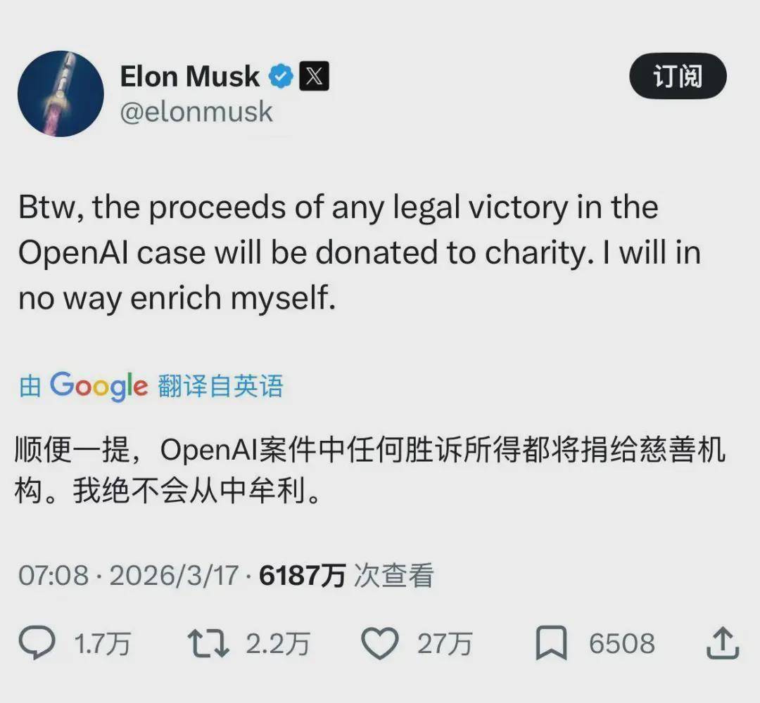 3月17日,特斯拉CEO埃隆·马斯克在X平台上公开表示,如果在对OpenAI的诉讼中获胜,所有由此获得的法律收益将会全部捐赠给慈善机构,而他个人将不从中获取任何收益。此前,马斯克已经起诉OpenAI和微软,并发起高达1340亿美元的索赔。该案目前已经进入激烈的庭前博弈阶段。(澎湃新闻)
