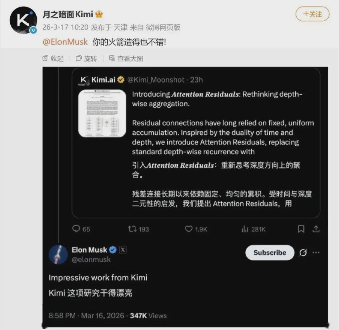 月之暗面Kimi官方账号3月17日发布微博,回应马斯克点赞其最新技术报告:“你的火箭造得也不错!”3月16日,月之暗面Kimi发布技术报告,对大模型十年没有根本性变化的核心结构残差连接进行重新设计,使每一层能够选择性地关注此前各层输出,而非统一求和。测试显示,48B模型训练效率提升1.25倍。论文发布后,马斯克发文称“令人印象深刻”。(IT之家)
