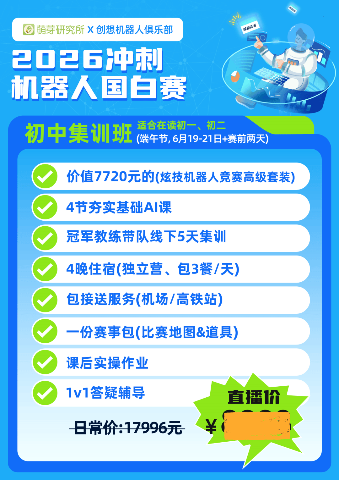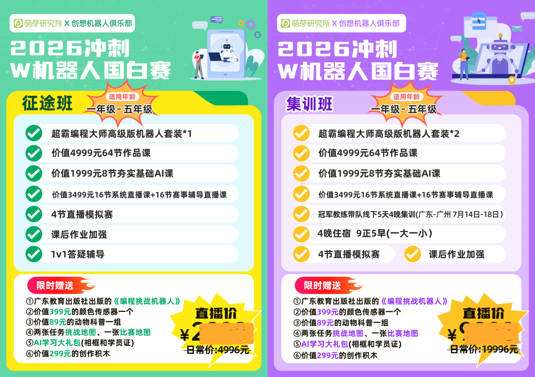 暑期班的直播间报名通道已开启,我也邀请了创想团队负责人赵老师来和大家深度解读26-28年AI机器人教育的新趋势,还有大家最关心的国家白名单赛事动态,直播间还有惊喜抽奖!