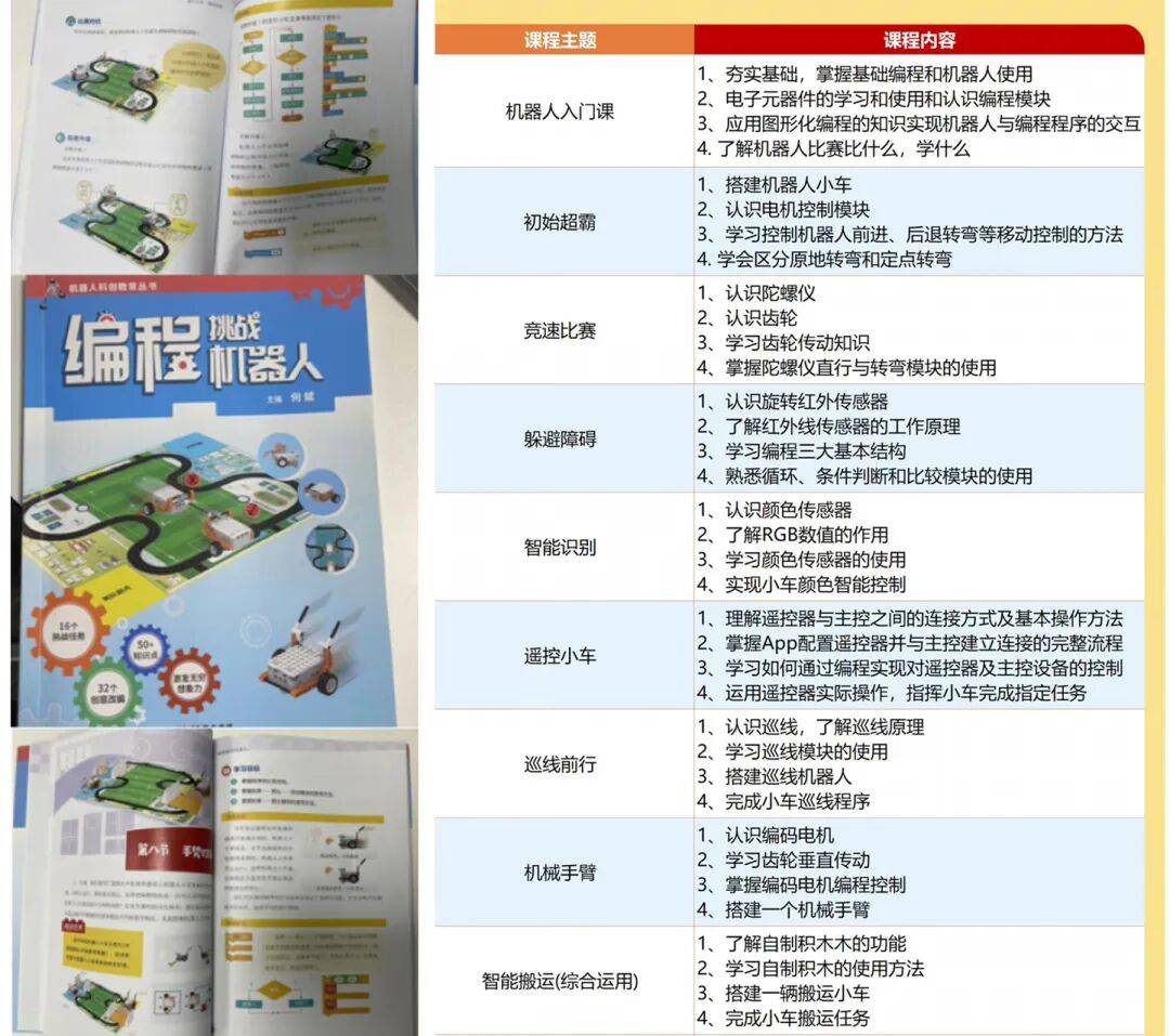 还会给孩子们附赠一本对应的教材,里面讲机器人比赛的细节拆解得很清楚,大家可以看右边得知识点了解大概的内容。